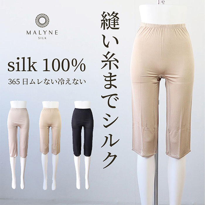 暑い時期には、太腿や膝裏の不快な汗を吸収発散し、寒い時期には優しく温めてくれるシルクのアンダーボトム。